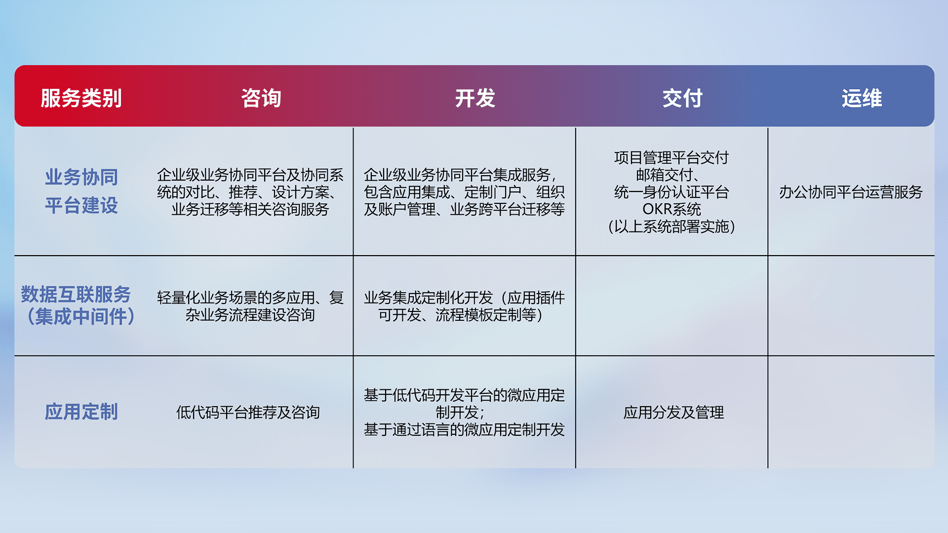 针对钉钉、、、、企微、、、IDaas等平台级产品提供产品的规划、、、、方案、、、交付、、、、定制化开发等服务,,,,实现如统一协同办公、、智能客户服务、、、混合会议管理、、、、智能数据查询、、等业务场景,,实现数字化转型。。